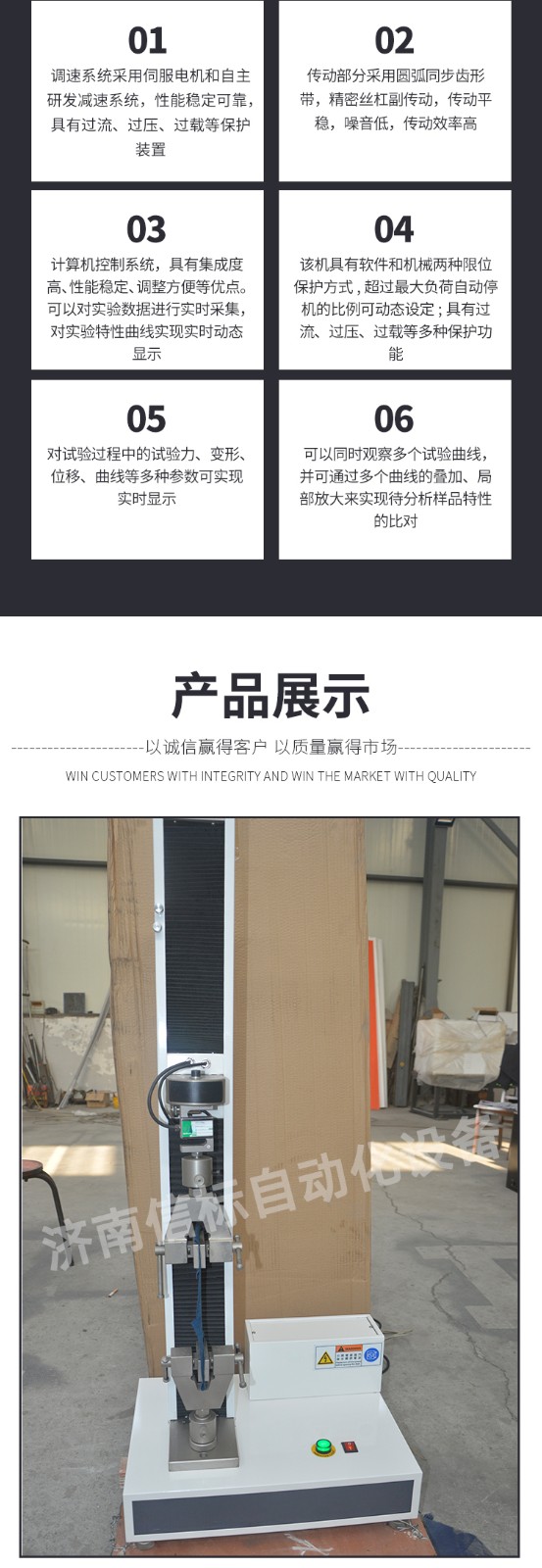 主要功能及特點: 1、主機: 1.1調速系統采用伺服電機和自主研發減速系統,性能穩定可靠,具有過流、過壓、過載等保護裝置。調速范圍可達0.05~500mm/min。 1.2傳動部分采用圓弧同步齒形帶,精密絲杠副傳動,傳動平穩,噪音低,傳動效率高。 1.3萬向節采用十字插銷結構,而且具有擺角限制功能,一方面便于試樣夾持,保證試驗同心度,另一方面很好的消除了不規則試樣對傳感器的影響。 2、控制系統、操作軟件及數據處理系統 2.1計算機控制系統,具有集成度高、性能穩定、調整方便等優點。可以對實驗數據進行實時采集,對實驗特性曲線實現實時動態顯示,試驗數據文件能以Access常用數據庫或SQLserve大型數據庫的方式保存,方便實現客戶的資源共享及網絡管理,以及用戶的再分析。對于用戶自定義的各種word2000報表,該軟件可輕松實現訪問,解決了不同用戶或同一用戶在不同時期對試驗報表有不同需要的難題。該軟件可處理試驗力、位移、 時間、變形的原始數據及由此派生的曲線。 2.2保護功能:該機具有軟件和機械兩種限位保護方式,超過最大負荷自動停機的比例可動態設定;具有過流、過壓、過載等多種保護功能。 2.3對于負荷、變形通道可實現自動標示,直觀方便。 2.4批量試驗可實現曲線的分層次顯示,曲線自動跟隨。 2.5該軟件可實現用戶自定義的速度設定,速度的計算機調整。還可實現高精度的速度標定,隨時調整速度檔位和編碼。