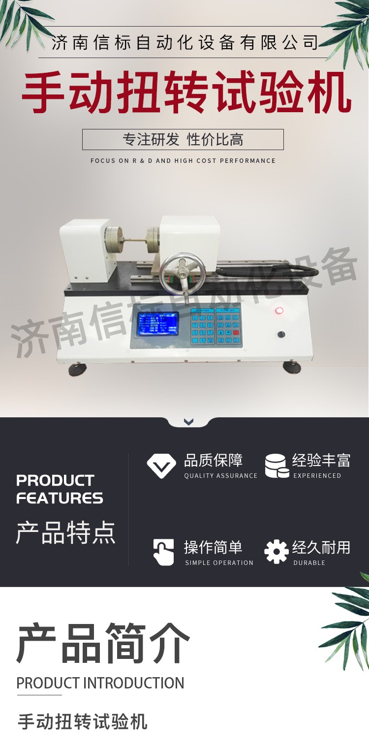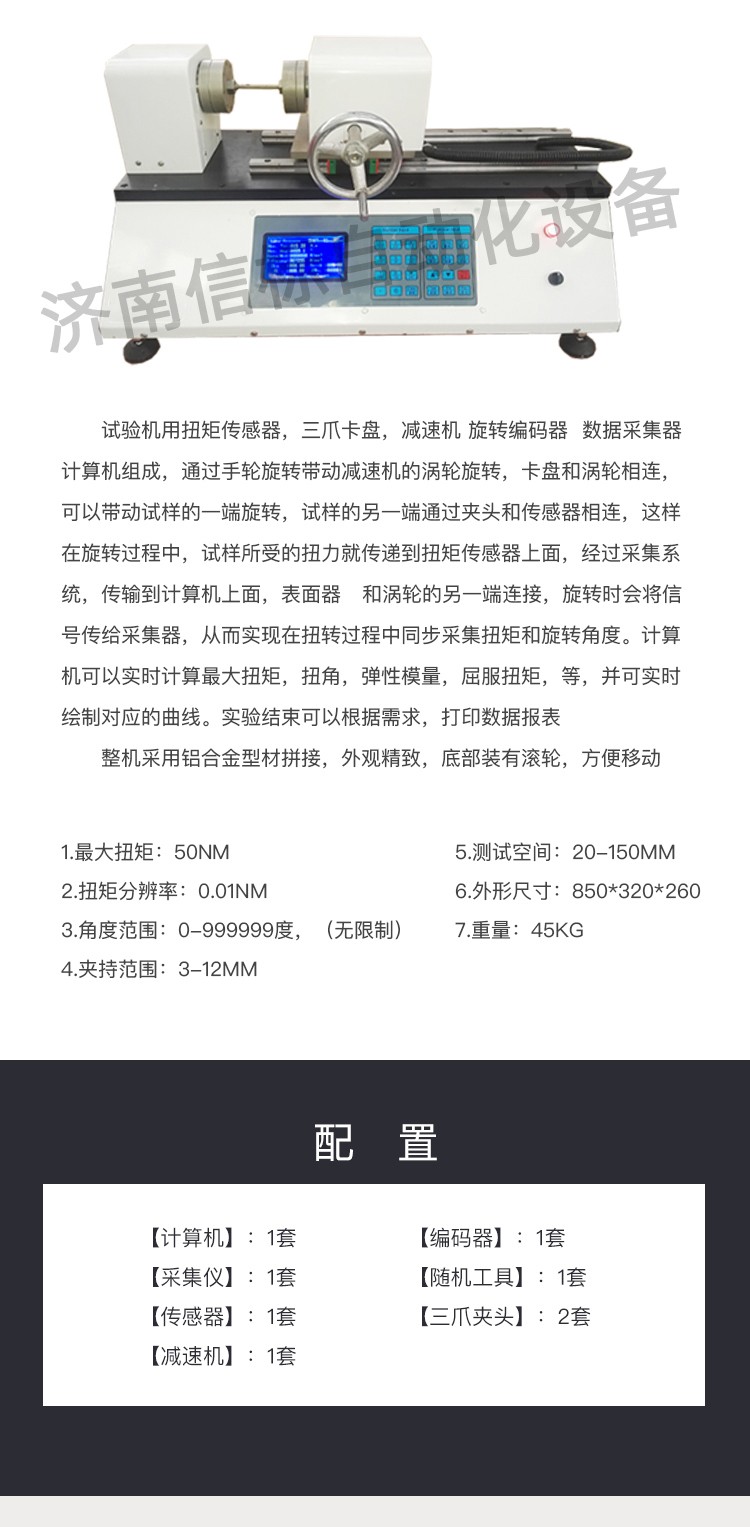 一、介紹 試驗機用扭矩傳感器,三爪卡盤,減速機 旋轉編碼器 數據采集器 計算機組成,通過手輪旋轉帶動減速機的渦輪旋轉,卡盤和渦輪相連,可以帶動試樣的一端旋轉,試樣的另一端通過夾頭和傳感器相連,這樣在旋轉過程中,試樣所受的扭力就傳遞到扭矩傳感器上面,經過采集系統,傳輸到計算機上面,表面器 和渦輪的另一端連接,旋轉時會將信號傳給采集器,從而實現在扭轉過程中同步采集扭矩和旋轉角度。計算機可以實時計算最大扭矩,扭角,彈性模量,屈服扭矩等,并可實時繪制對應的曲線。實驗結束可以根據需求,打印數據報表,整機采用鋁合金型材拼接,外觀精致,底部裝有滾輪,方便移動。試驗機用扭矩傳感器,三爪卡盤,減速機 旋轉編碼器 數據采集器 計算機組成,通過手輪旋轉帶動減速機的渦輪旋轉,卡盤和渦輪相連,可以帶動試樣的一端旋轉,試樣的另一端通過夾頭和傳感器相連,這樣在旋轉過程中,試樣所受的扭力就傳遞到扭矩傳感器上面,經過采集系統。 二、基本參數 1.最大扭矩:50NM 2.扭矩分辨率:0.01NM 3.角度范圍:0-999999度,(無限制) 4.夾持范圍:3-12mm 5.測試空間:20-150mm 6.外形尺寸:850*320*260 7.重量:45kg 三、配置: 1.計算機:1套 2.采集儀:1套 3.傳感器:1套 4.減速機:1套 5.編碼器:1套 6.隨機工具:1套 7.三爪夾頭:2套