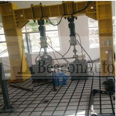 驅動車橋疲勞試驗機 前后橋耐久疲勞試驗臺 驅動車橋疲勞試驗機 前后橋耐久疲勞試驗臺產品用途: PMS-500驅動車橋疲勞試驗機 前后橋耐久疲勞試驗臺主要適用于對各種大型零部件如:橋梁、桁架、汽車底盤、前后橋、機車車架、底盤及各種混凝土結構件進行靜態壓縮試驗及動態單向脈動疲勞試驗。該機具有設計可靠、操作簡單、節約能源,運行成本低廉等顯著特點。 驅動車橋疲勞試驗機 前后橋耐久疲勞試驗臺主要技術指標: 1、動態試驗力:1000kN ; 2、靜態試驗力:1000kN,示值精度±1%(20%FS起示值相對誤差); 3、工作頻率范圍:2-8Hz(無級可調); 4、脈動器排量:800ml/次; 5、1000kN作動器基本參數 5.1振幅:15mm; 5.2活塞行程:120mm; 5.3絲杠伸出量:450mm; 5.4加長管長度:500mm、1000mm; 5.5計算機滿量程顯示值:500.0; 5.6另有25kN、50kN、100kN、250kN、500kN等規格作動器(特殊配件,需單獨購買)。 6、電機功率:22kW。